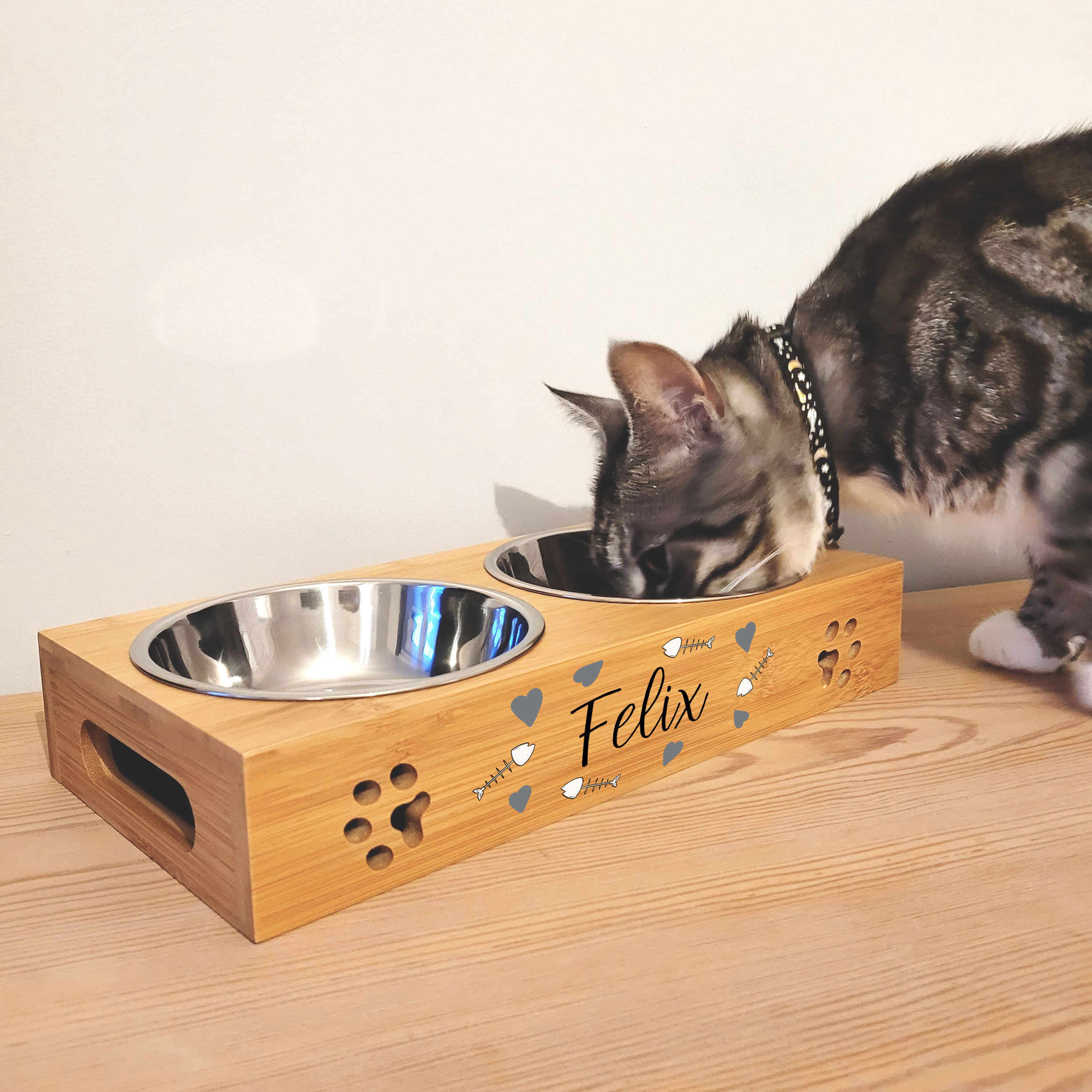 Personalised Bamboo / Stainless Steel Cat Bowl – Fish & Grey Hearts
